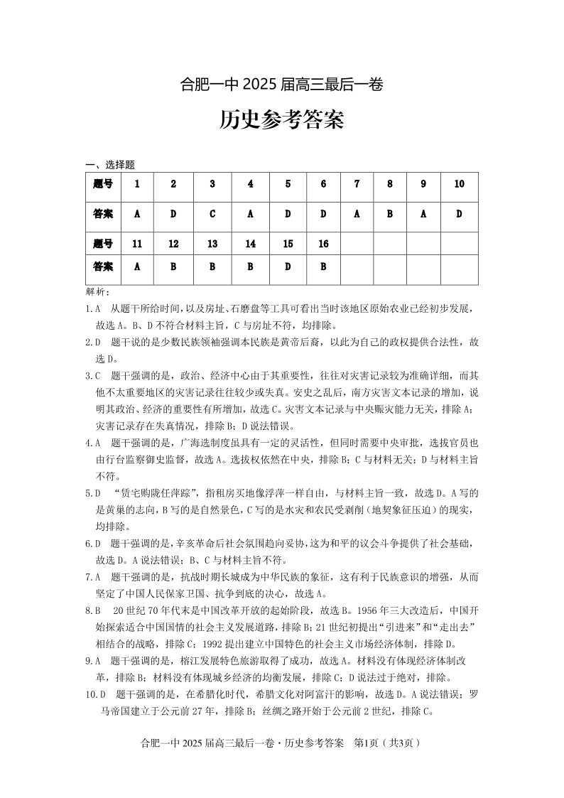 安徽省合肥一中2025届高三最后一卷 历史参考答案.pdf