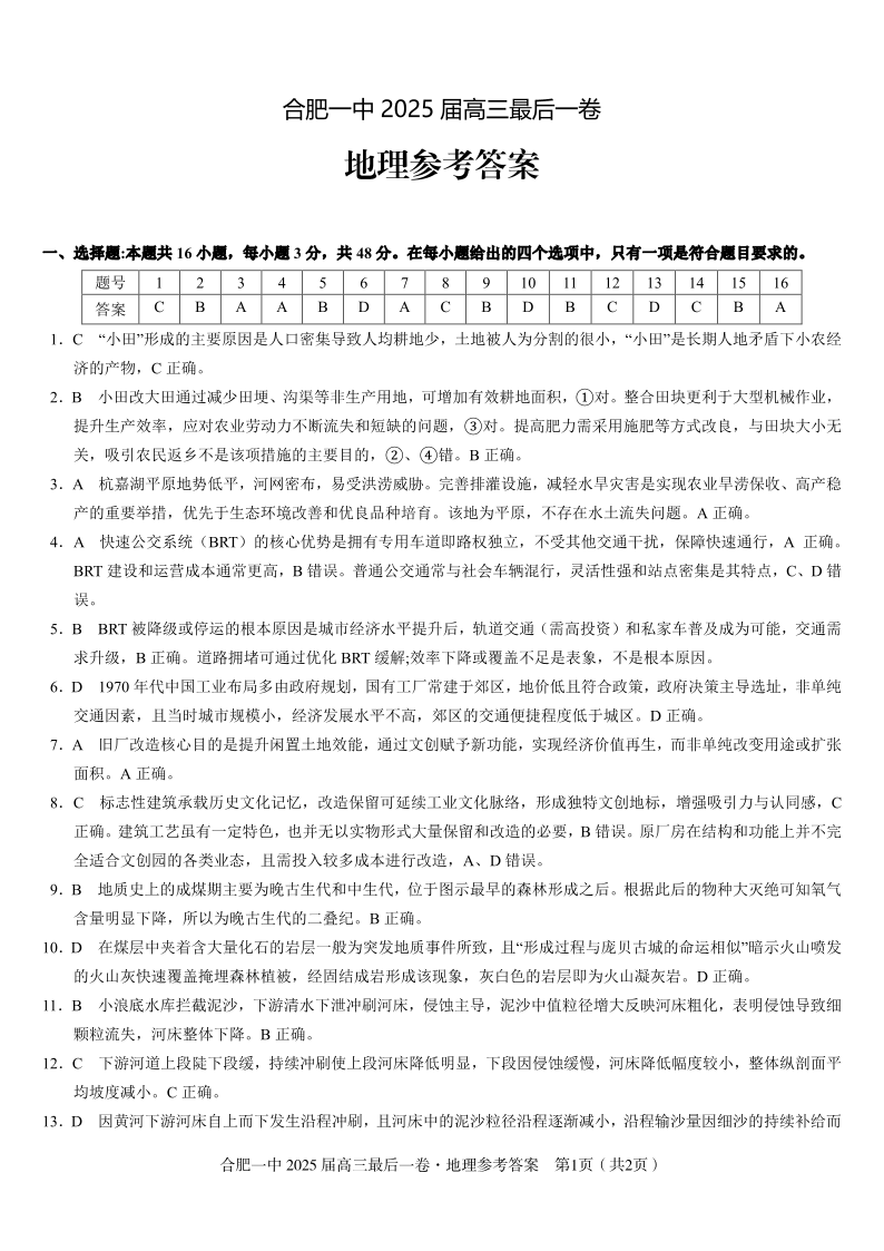 安徽省合肥一中2025届高三最后一卷 地理参考答案.pdf