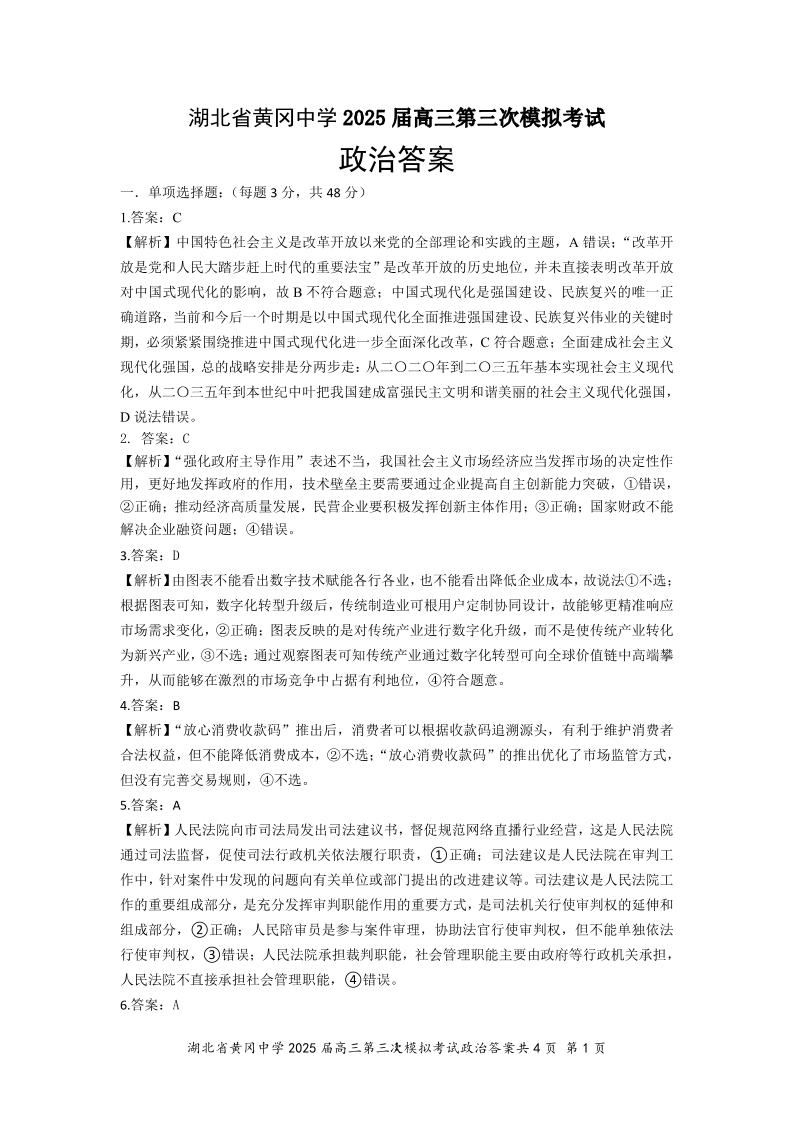 湖北省黄冈中学2025届高三第三次模拟考试 政治答案.pdf
