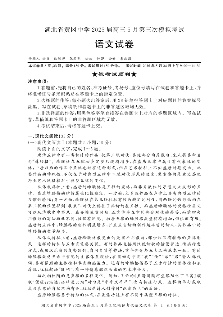 湖北省黄冈中学2025届高三第三次模拟考试 语文.pdf