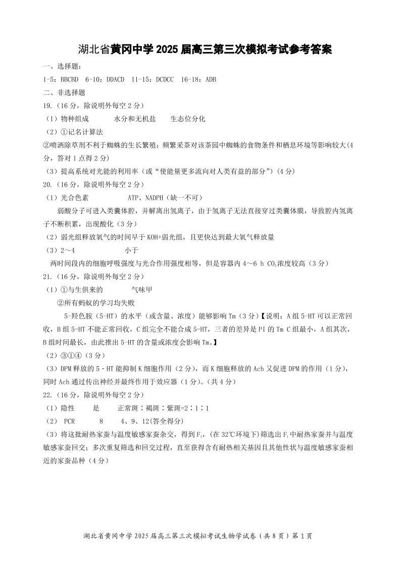 湖北省黄冈中学2025届高三第三次模拟考试 生物答案.pdf