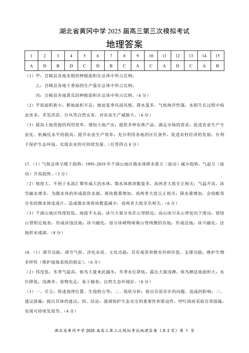 湖北省黄冈中学2025届高三第三次模拟考试 地理答案.pdf