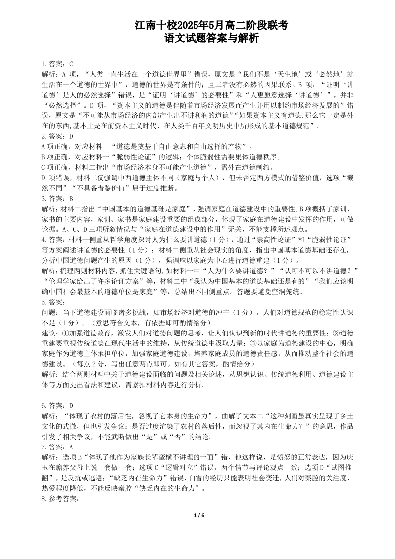 安徽省“江南十校”2024-2025学年高二5月份阶段联考 语文答案.pdf