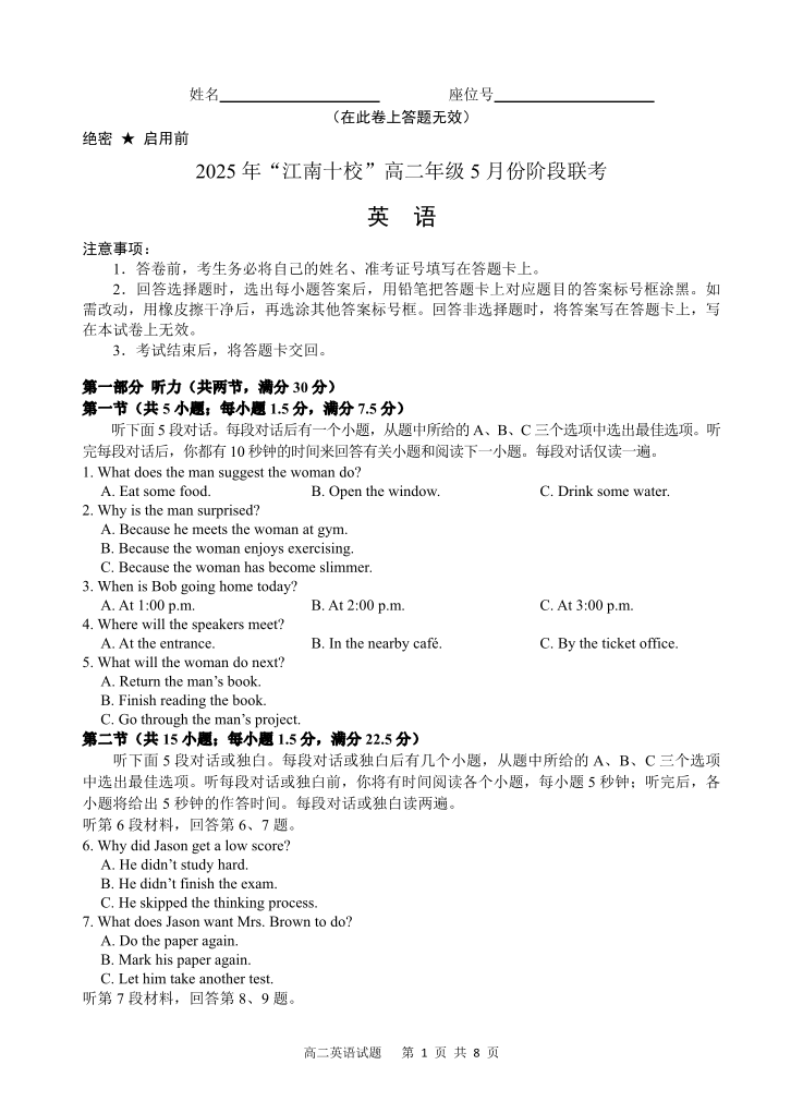 安徽省“江南十校”2024-2025学年高二5月份阶段联考 英语.pdf