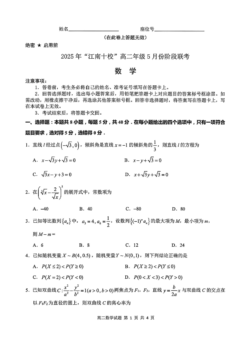 安徽省“江南十校”2024-2025学年高二5月份阶段联考 数学.pdf