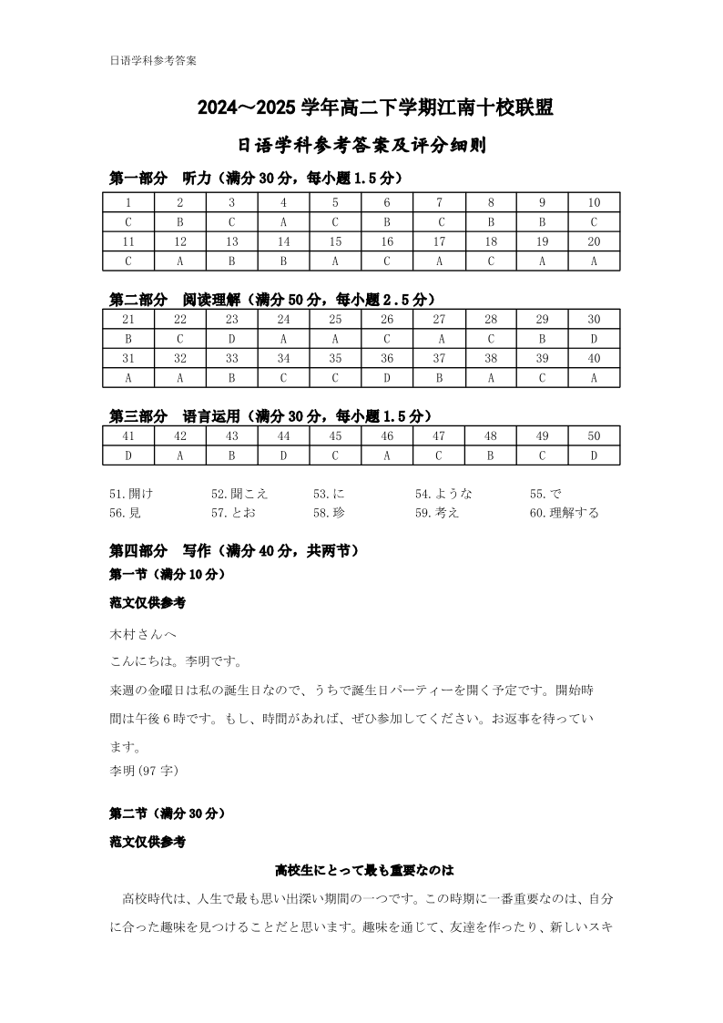 安徽省“江南十校”2024-2025学年高二5月份阶段联考 日语答案.pdf