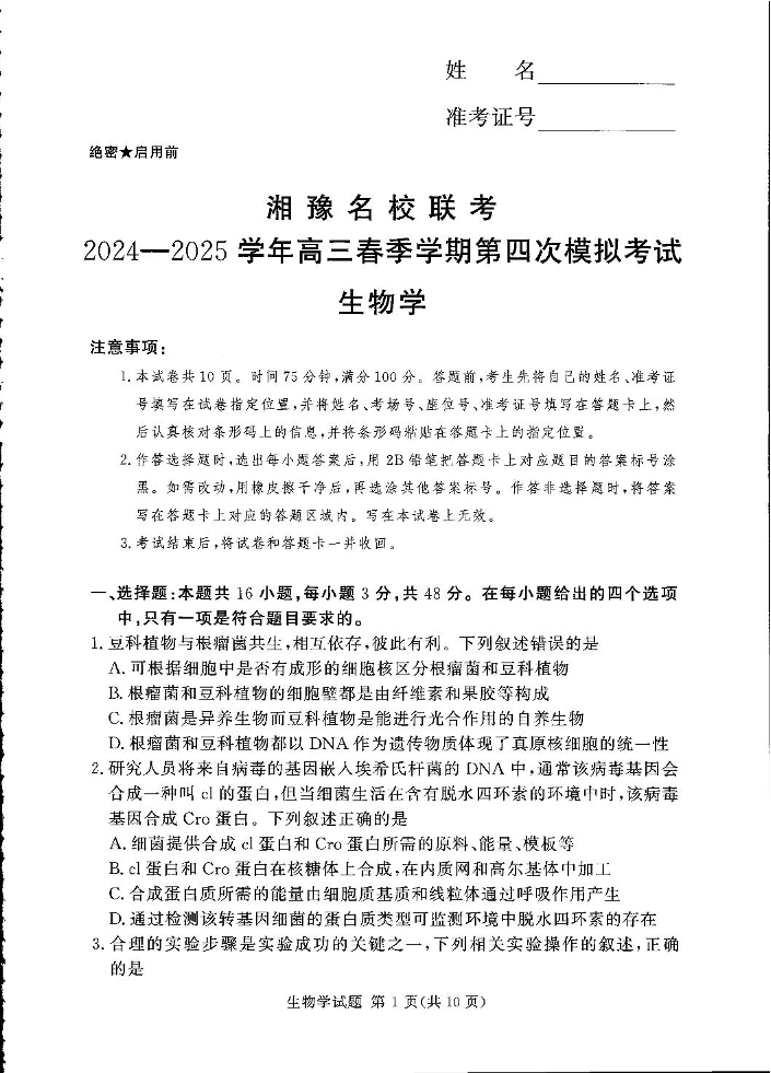 湘豫名校联考2024-2025学年高三下学期第四次模拟考试 生物.pdf