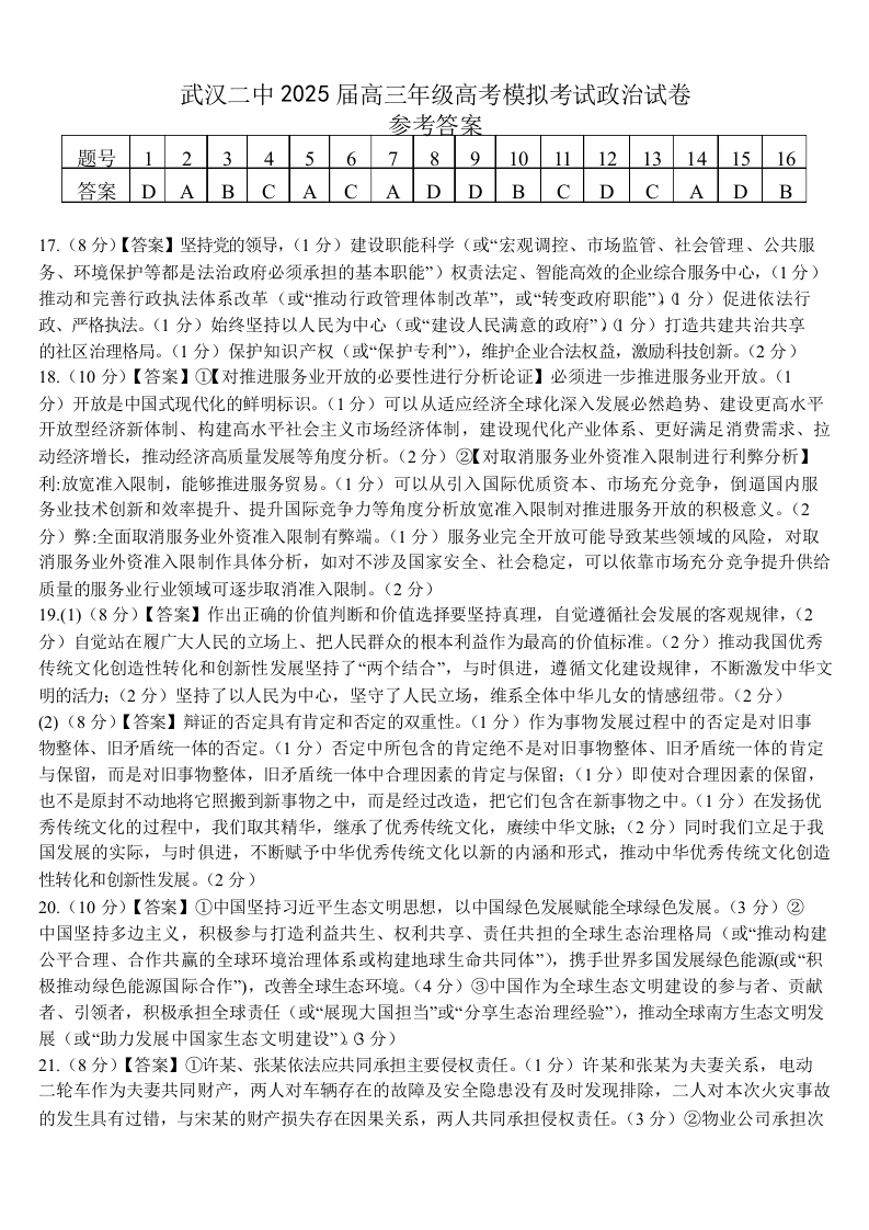 湖北省武汉市第二中学高三下学期5月高考模拟预测 政治答案.docx