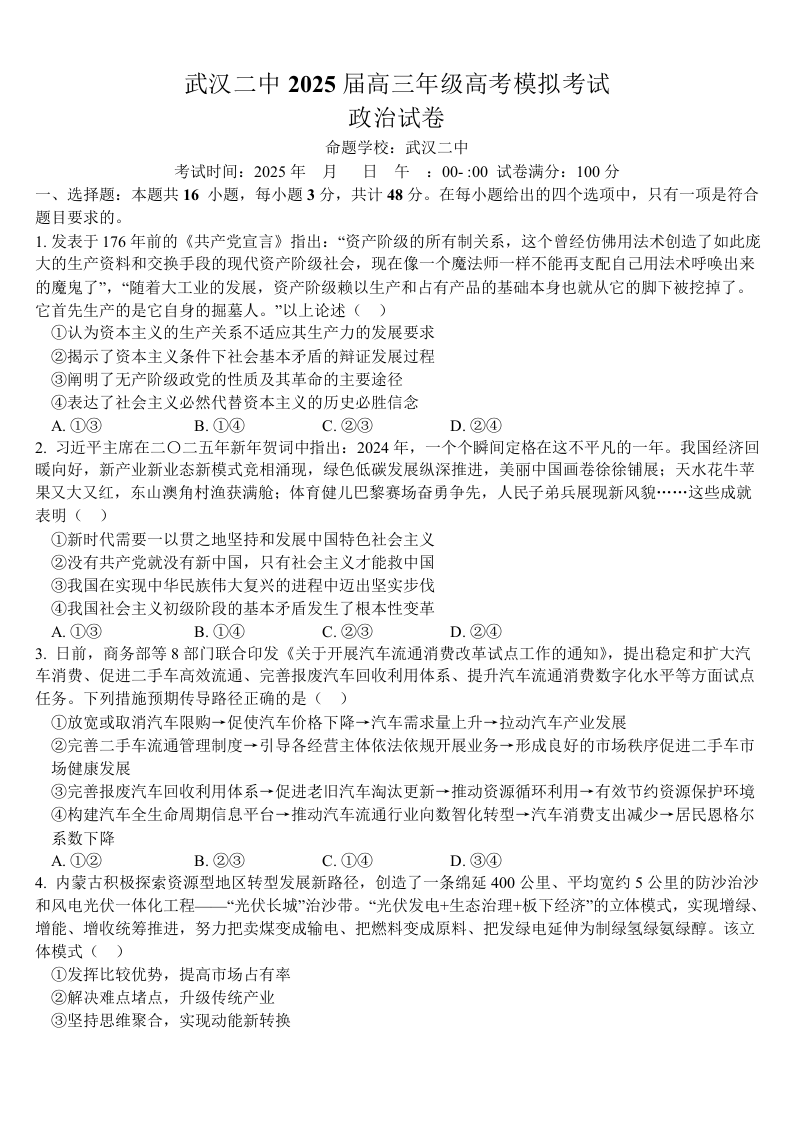 湖北省武汉市第二中学高三下学期5月高考模拟预测 政治.docx