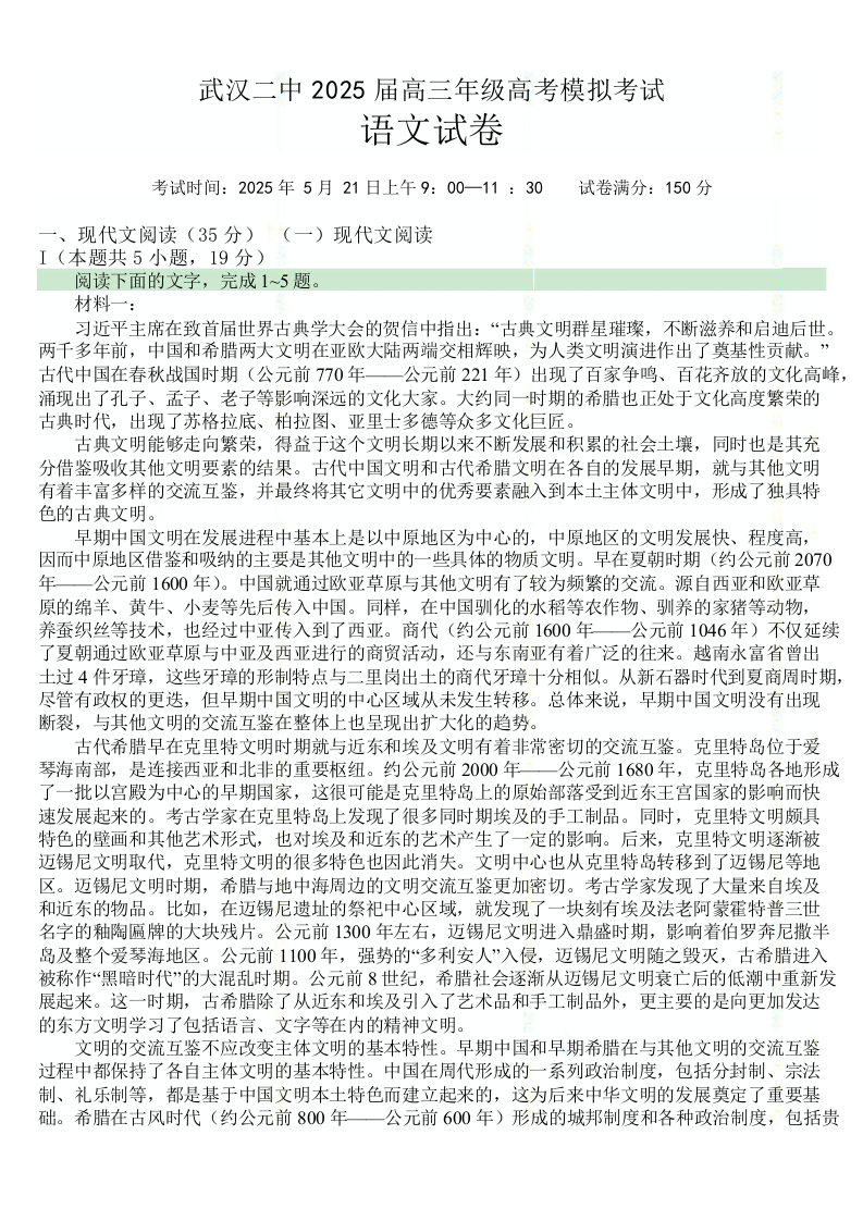 湖北省武汉市第二中学高三下学期5月高考模拟预测 语文.docx