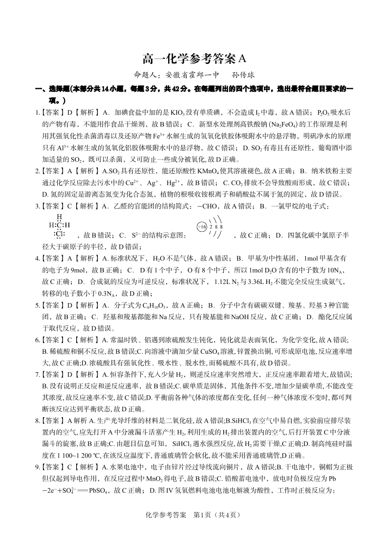 化学答案A·2025年5月高一阶段考.pdf