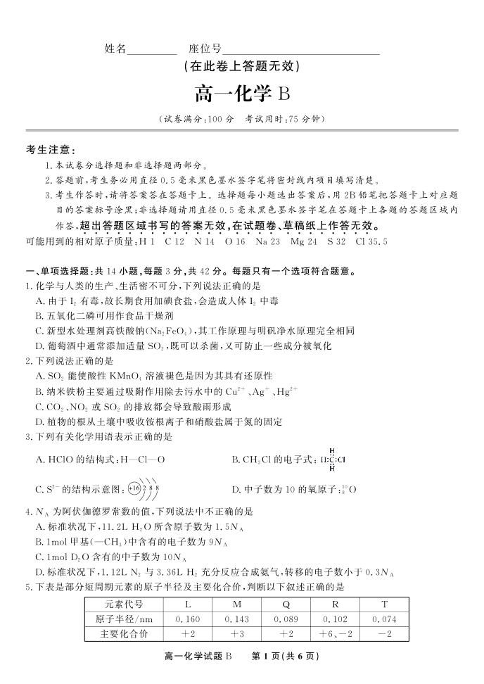 化学试题B·2025年5月高一阶段考.pdf