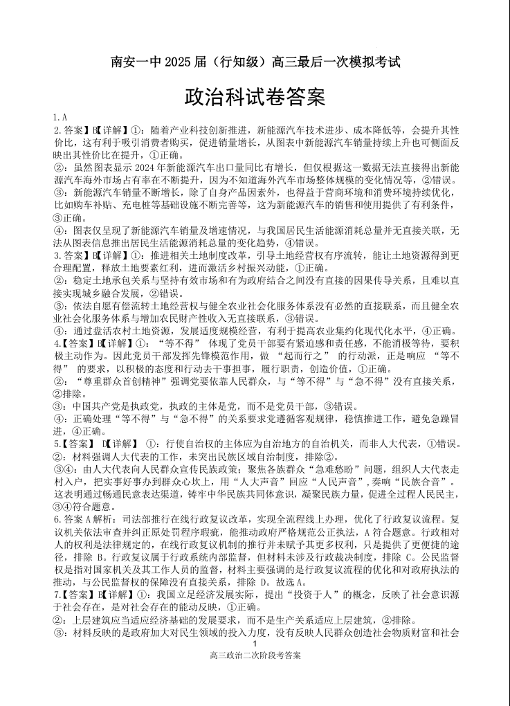 南安一中2025届(行知级)高三最后一次模拟考试 政治答案.docx