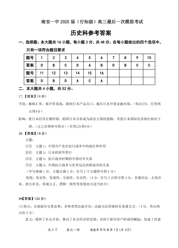 南安一中2025届(行知级)高三最后一次模拟考试 历史答案.docx