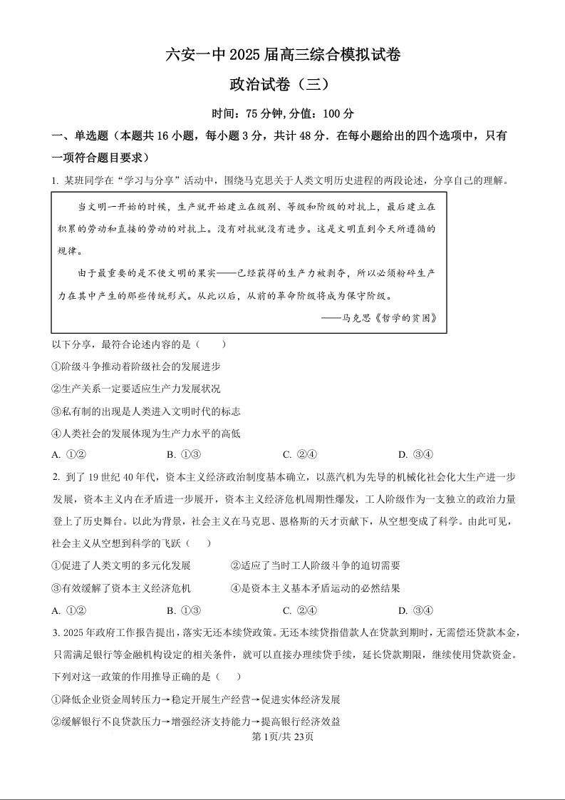 安徽省六安第一中学2025届高三下学期模拟预测(三)政治(含答案).docx