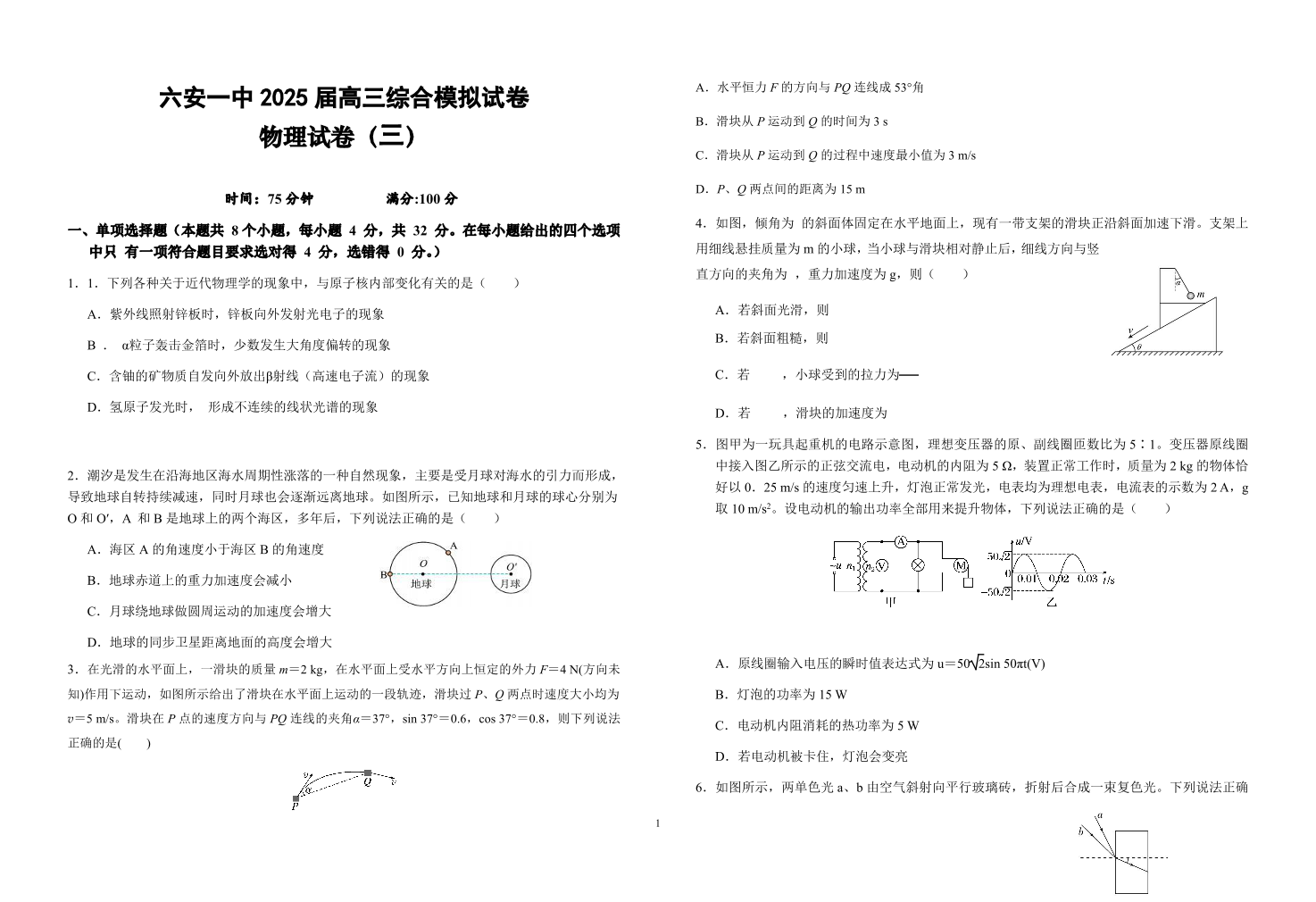 安徽省六安第一中学2025届高三下学期模拟预测(三)物理(含答案).pdf