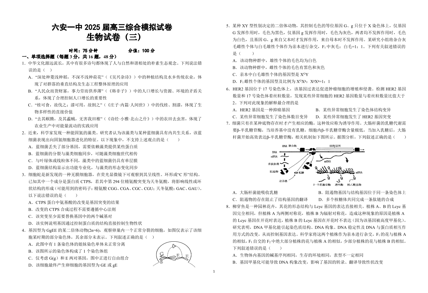安徽省六安第一中学2025届高三下学期模拟预测(三)生物(含答案).pdf