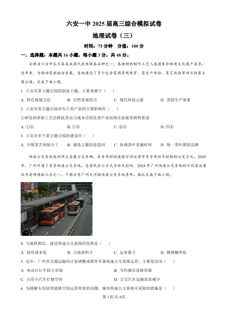 安徽省六安第一中学2025届高三下学期模拟预测(三)地理(含答案).pdf