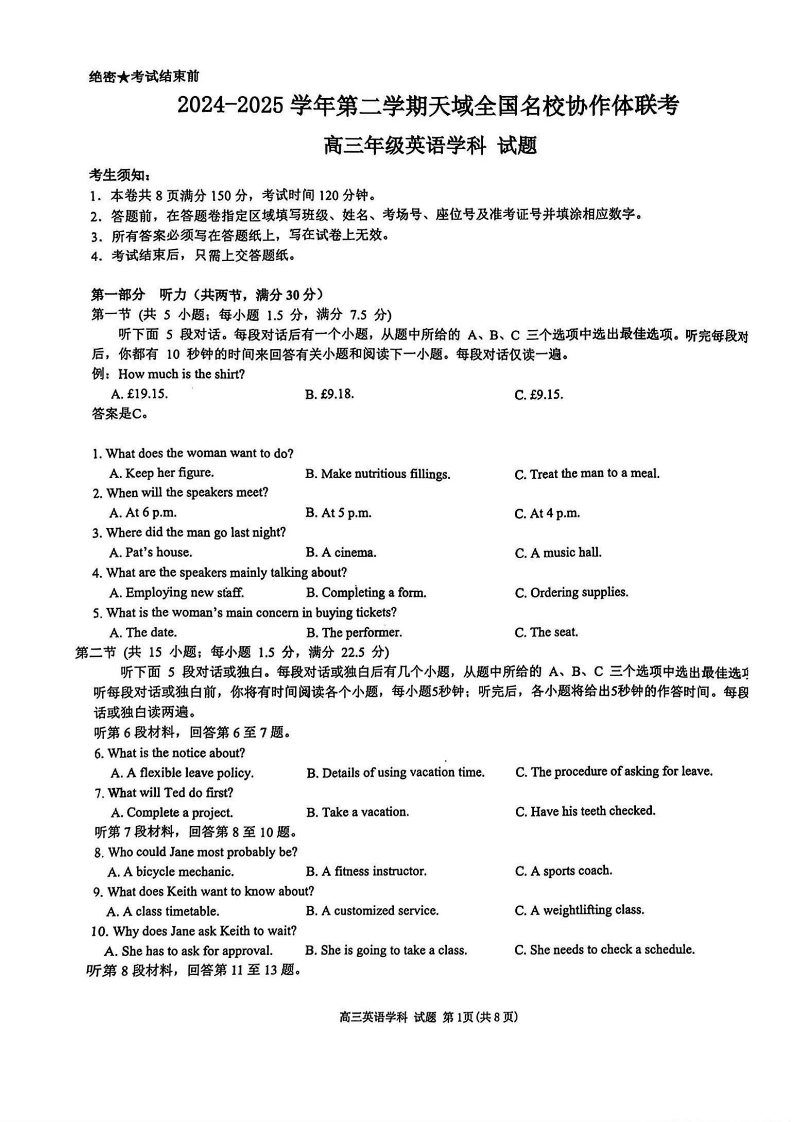2024-2025学年第二学期天域全国名校协作体联考 英语.pdf