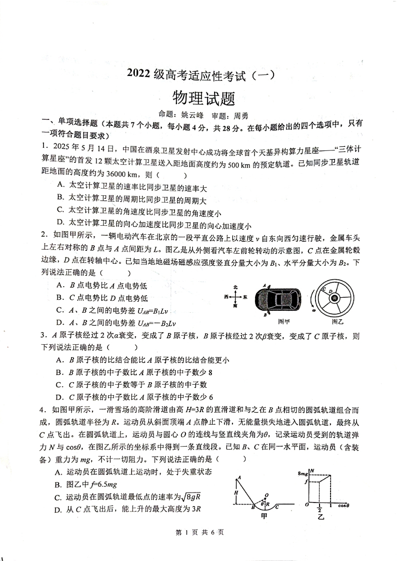 四川省绵阳中学2025届高三下学期高考适应性考试(一)物理(含答案).pdf