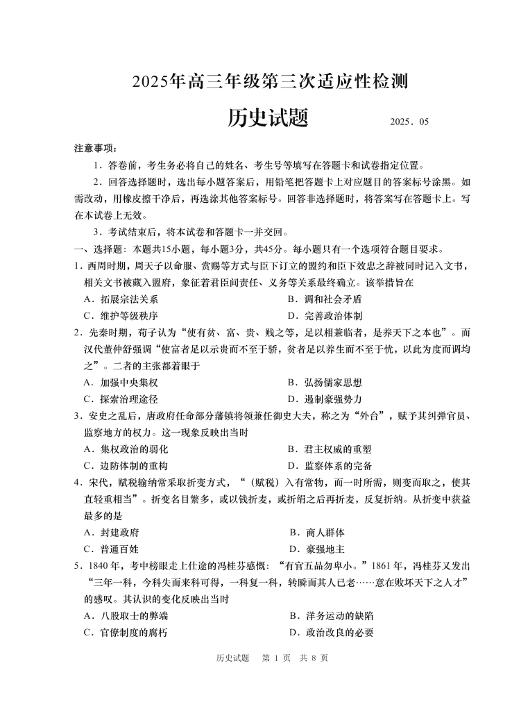 山东省青岛市2025年高三年级第三次适应性检测 历史.pdf