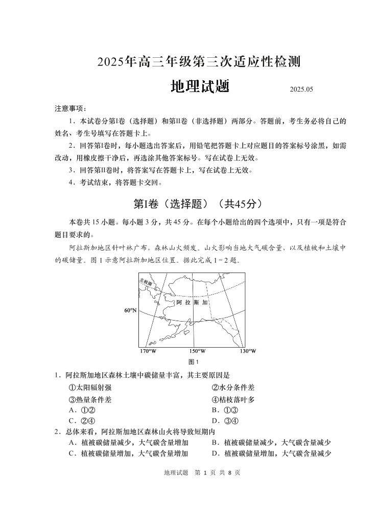 山东省青岛市2025年高三年级第三次适应性检测 地理.pdf
