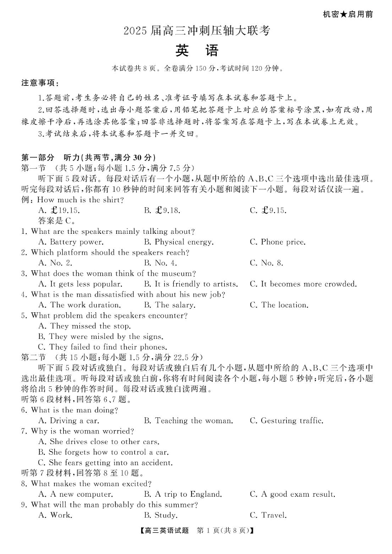 2025届湖南高三天壹冲刺压轴大联考 英语试题(含答案).pdf