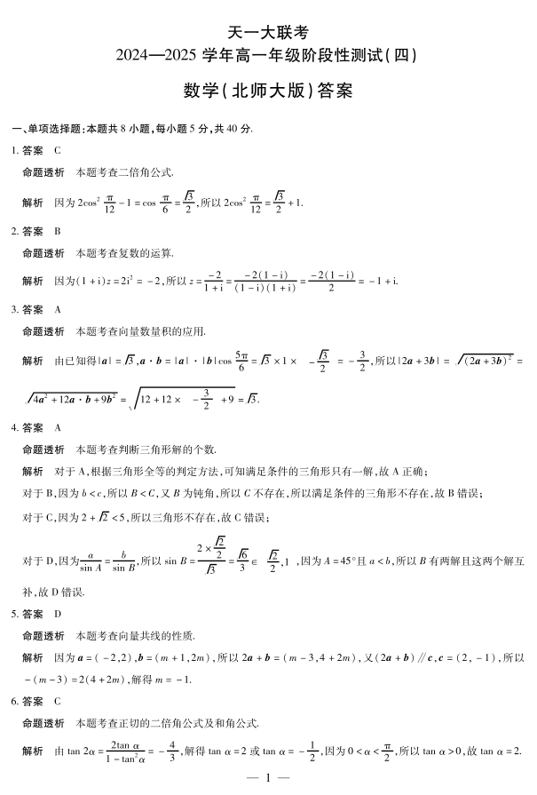 数学北师大版高一四联答案.pdf