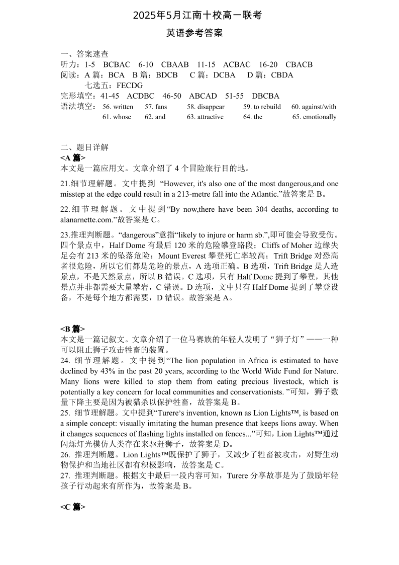 安徽省“江南十校”2024-2025学年高一年级5月份阶段联考 英语参考答案.pdf