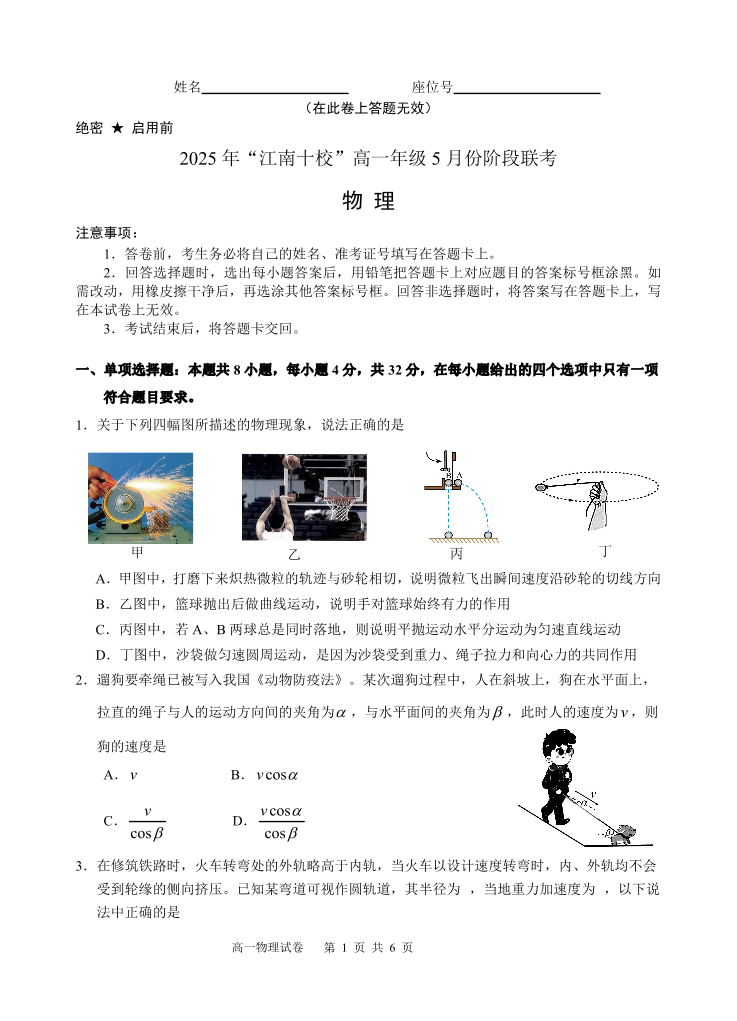 安徽省“江南十校”2024-2025学年高一年级5月份阶段联考 物理.pdf