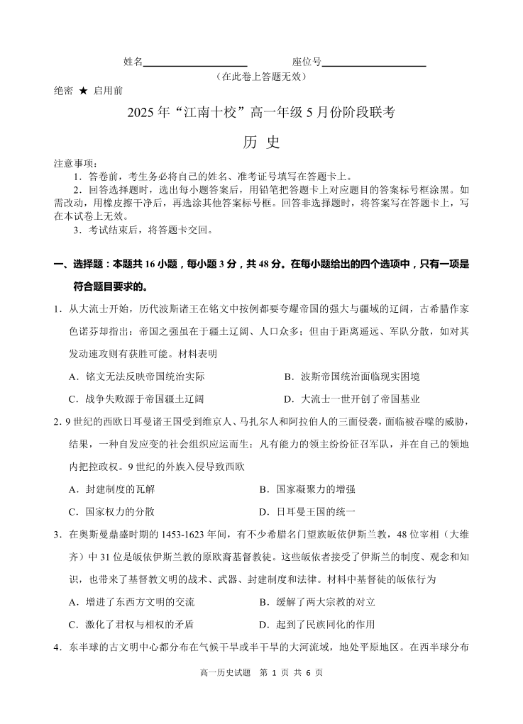 安徽省“江南十校”2024-2025学年高一年级5月份阶段联考 历史.pdf