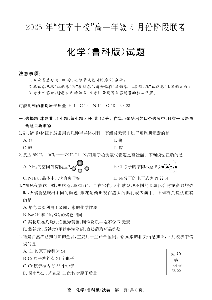 安徽省“江南十校”2024-2025学年高一年级5月份阶段联考 化学鲁科版.pdf
