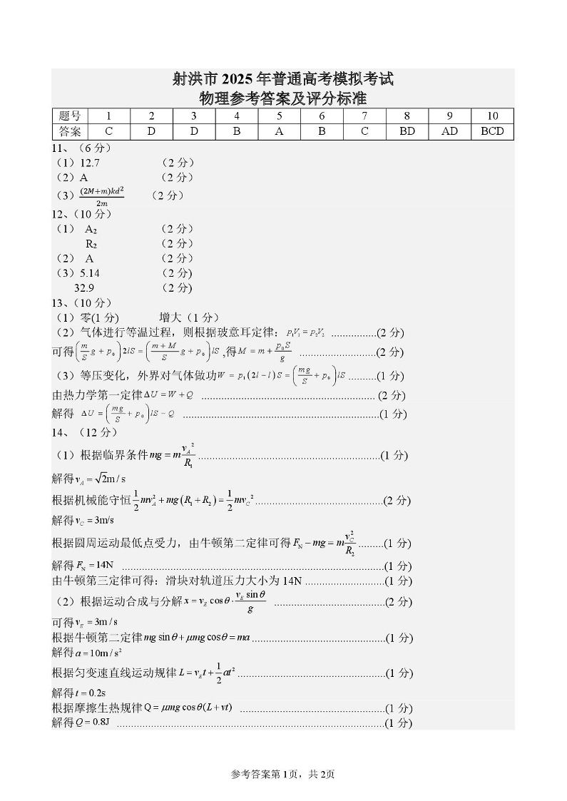 四川省射洪市2025届高三下学期5月模拟测试 物理答案.pdf