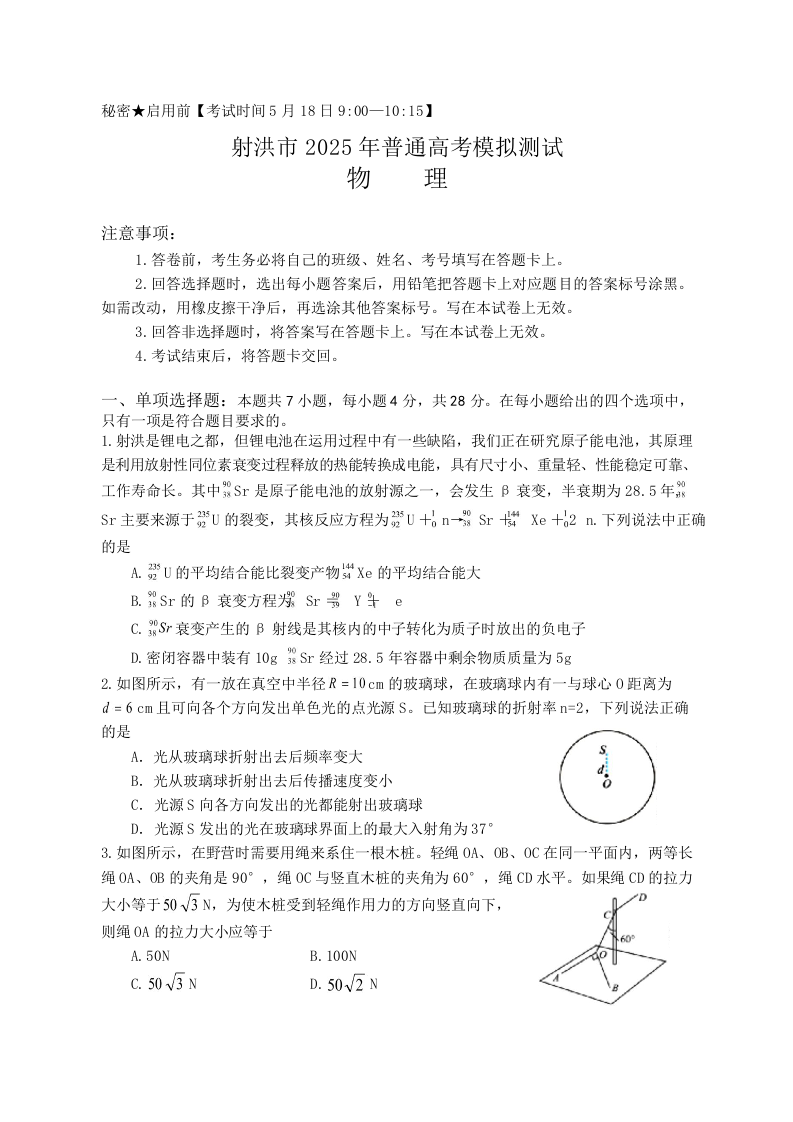 四川省射洪市2025届高三下学期5月模拟测试 物理.docx