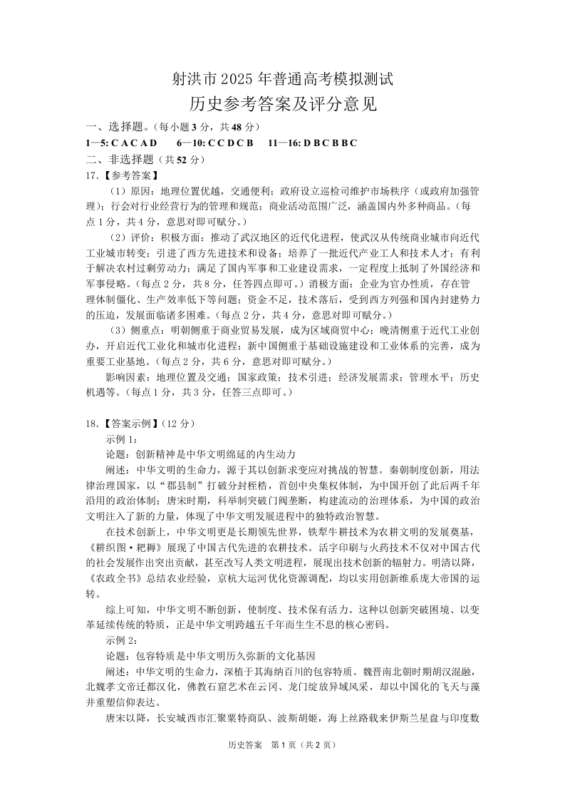 四川省射洪市2025届高三下学期5月模拟测试 历史答案.docx