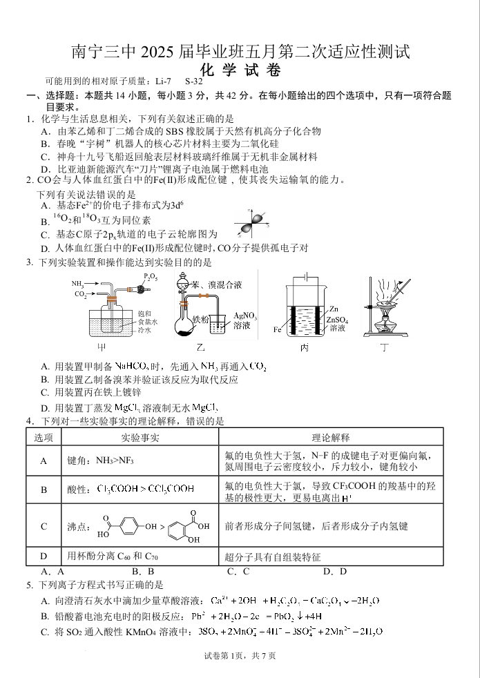 南宁三中2025届毕业班五月第二次适应性测试 化学(含答案).docx
