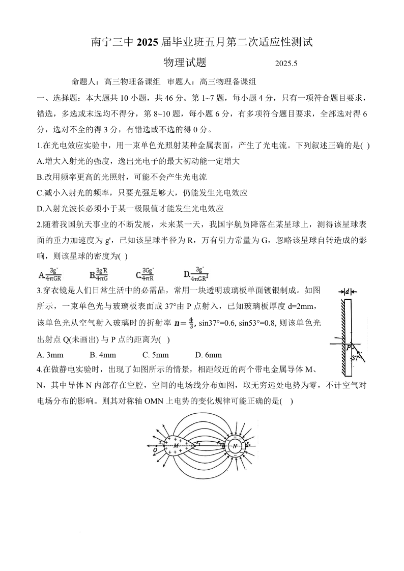 南宁三中2025届毕业班五月第二次适应性测试 物理(含答案).pdf