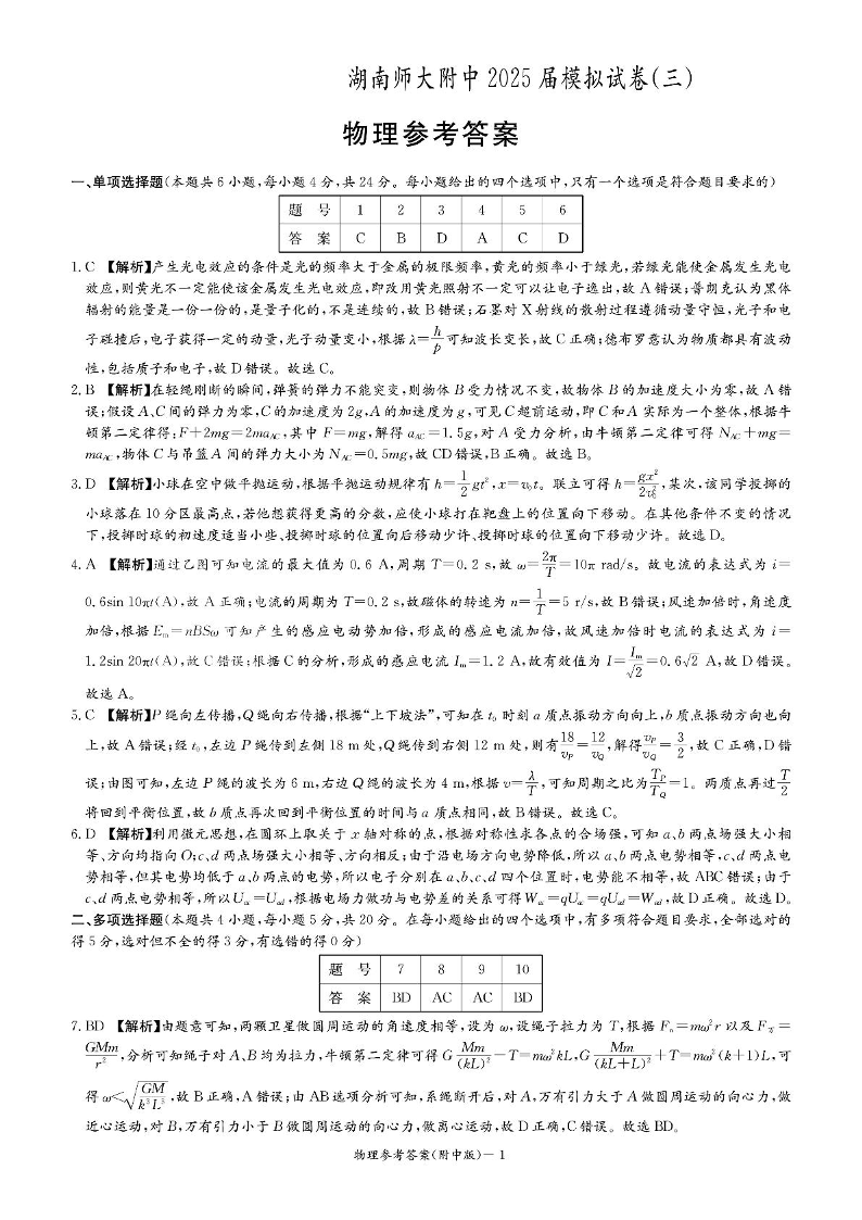 湖南师大附中2025届模拟试卷(三)-物理答案.pdf