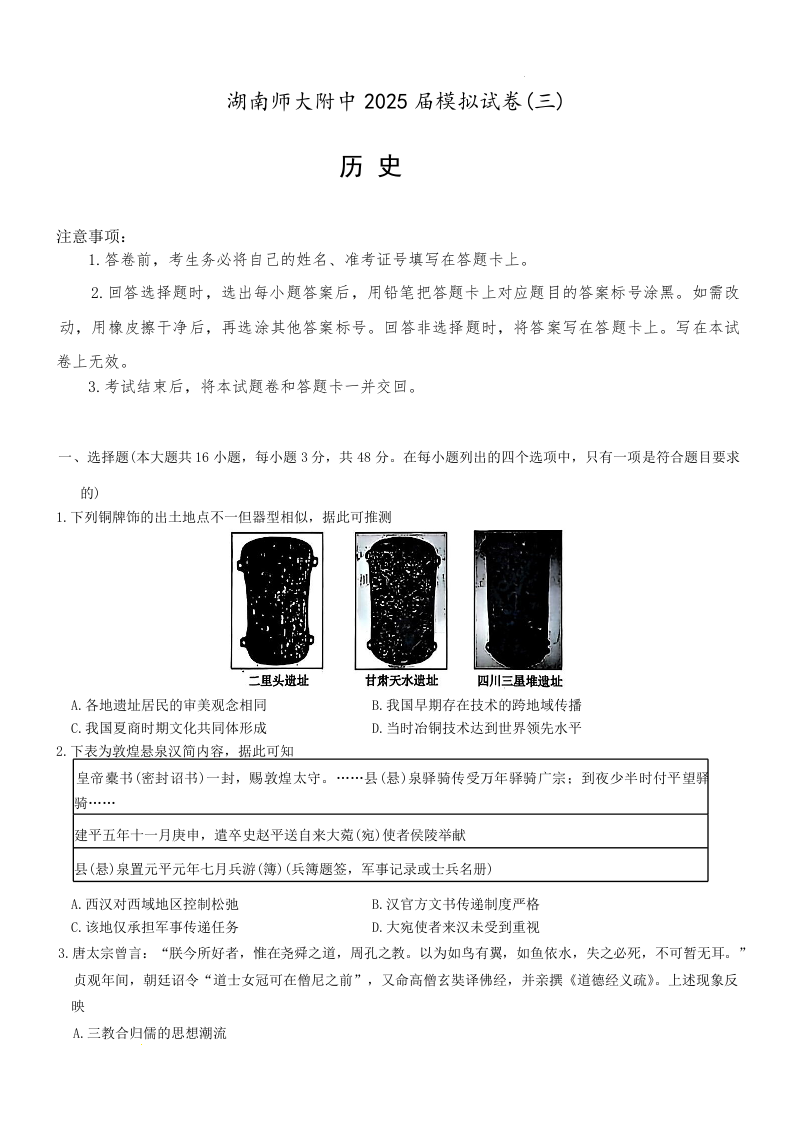湖南师大附中2025届模拟试卷(三)-历史(含答案).docx