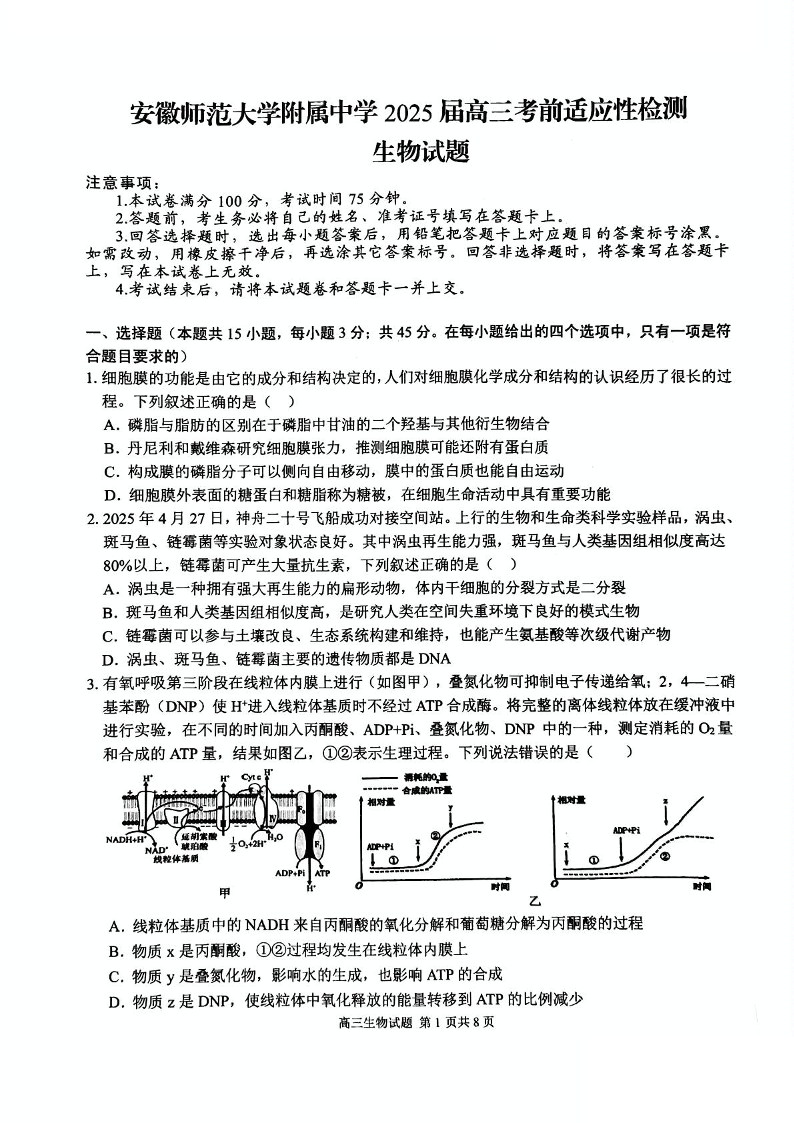 安徽师范大学附属中学2025届高三考前适应性检测 生物试卷(含答案).pdf