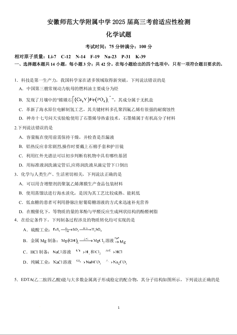 安徽师范大学附属中学2025届高三考前适应性检测 化学试题(含答案).docx