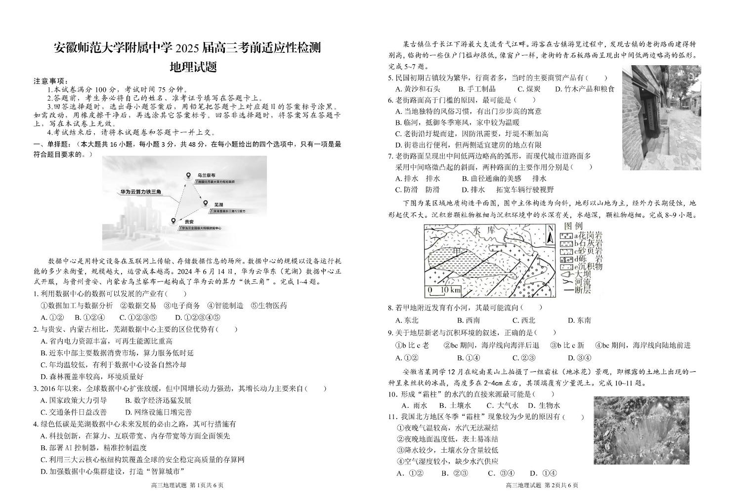 安徽师范大学附属中学2025届高三考前适应性检测 地理试题(含答案).pdf