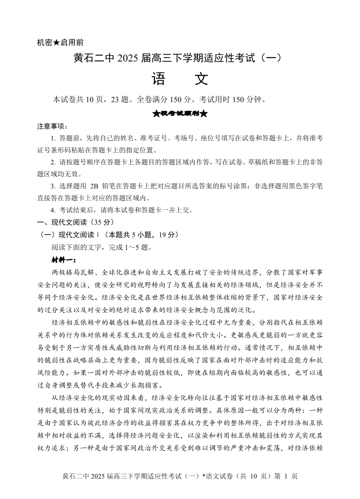 黄石二中2025届高三下学期适应性考试(一)语文.pdf