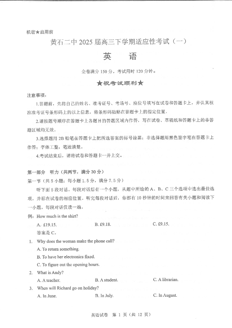 黄石二中2025届高三下学期适应性考试(一)英语.pdf