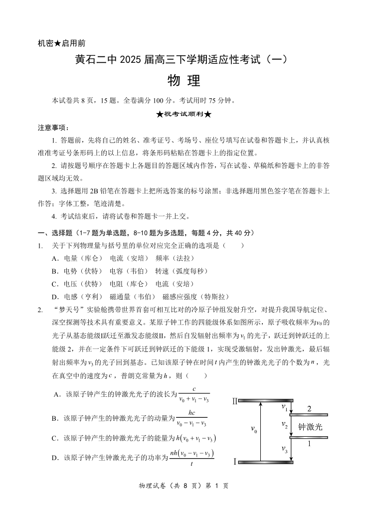 黄石二中2025届高三下学期适应性考试(一)物理.pdf