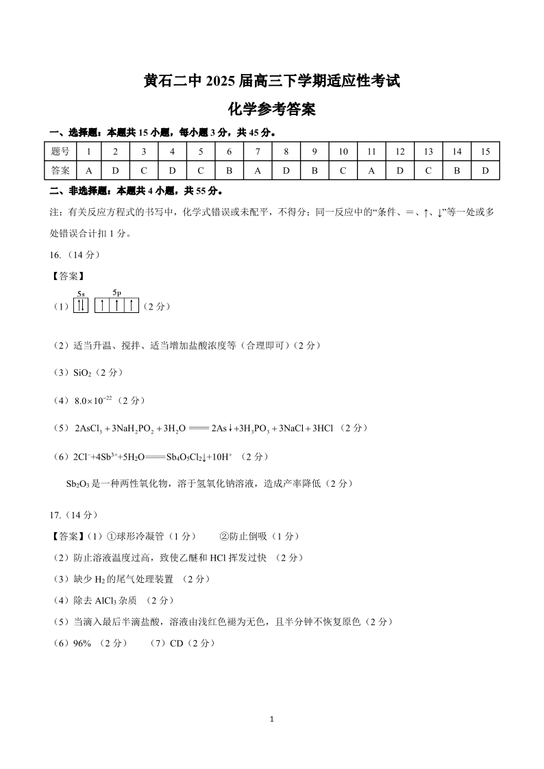 黄石二中2025届高三下学期适应性考试(一)化学答案.pdf