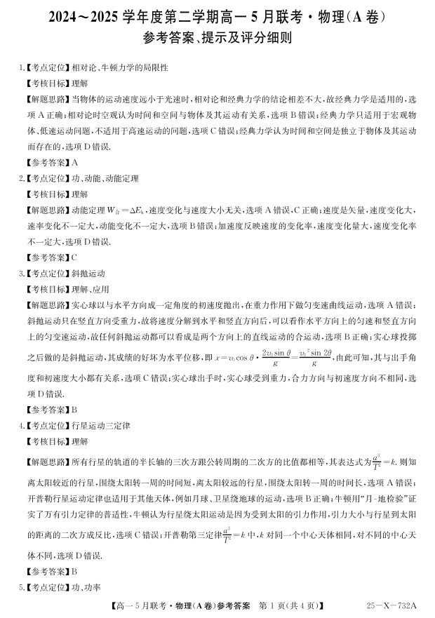 安徽省县中联盟2024-2025学年高一下学期5月联考 物理答案.pdf