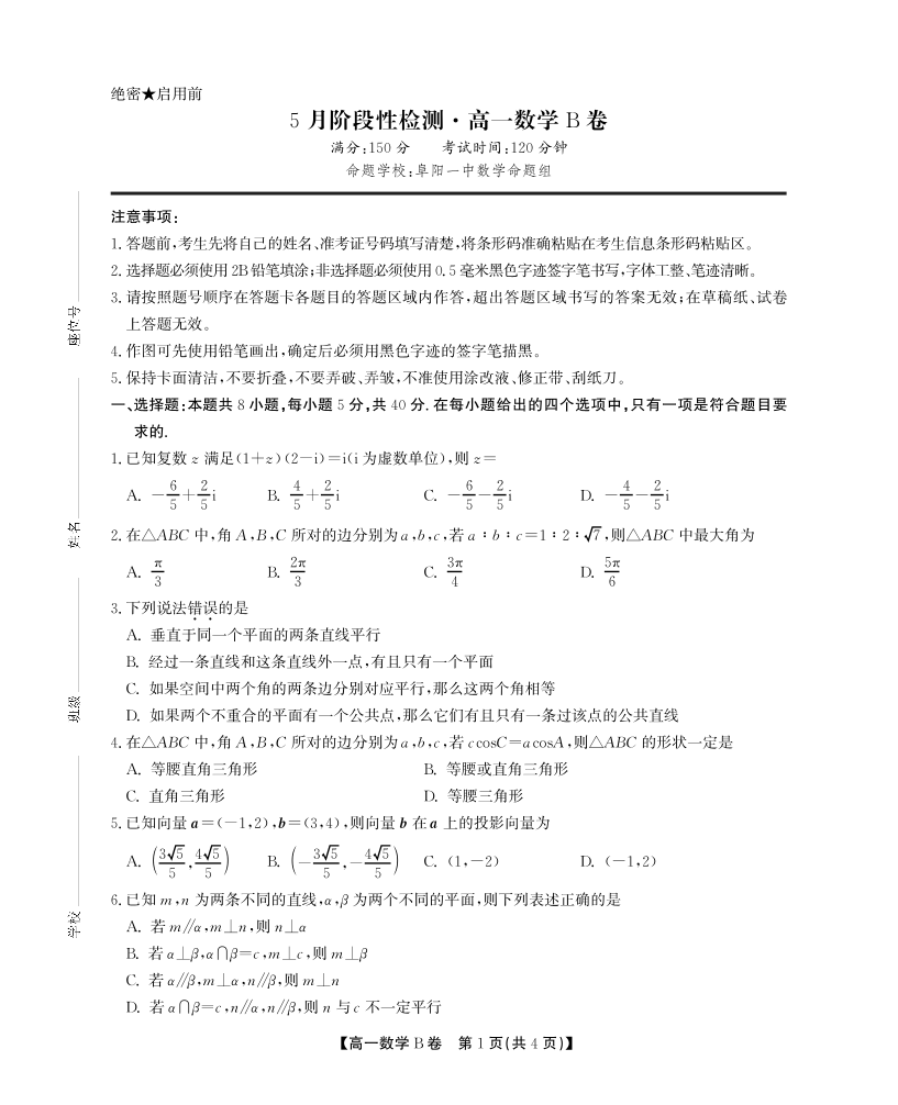 安徽省鼎尖名校高一5月阶段性检测 数学B卷.pdf
