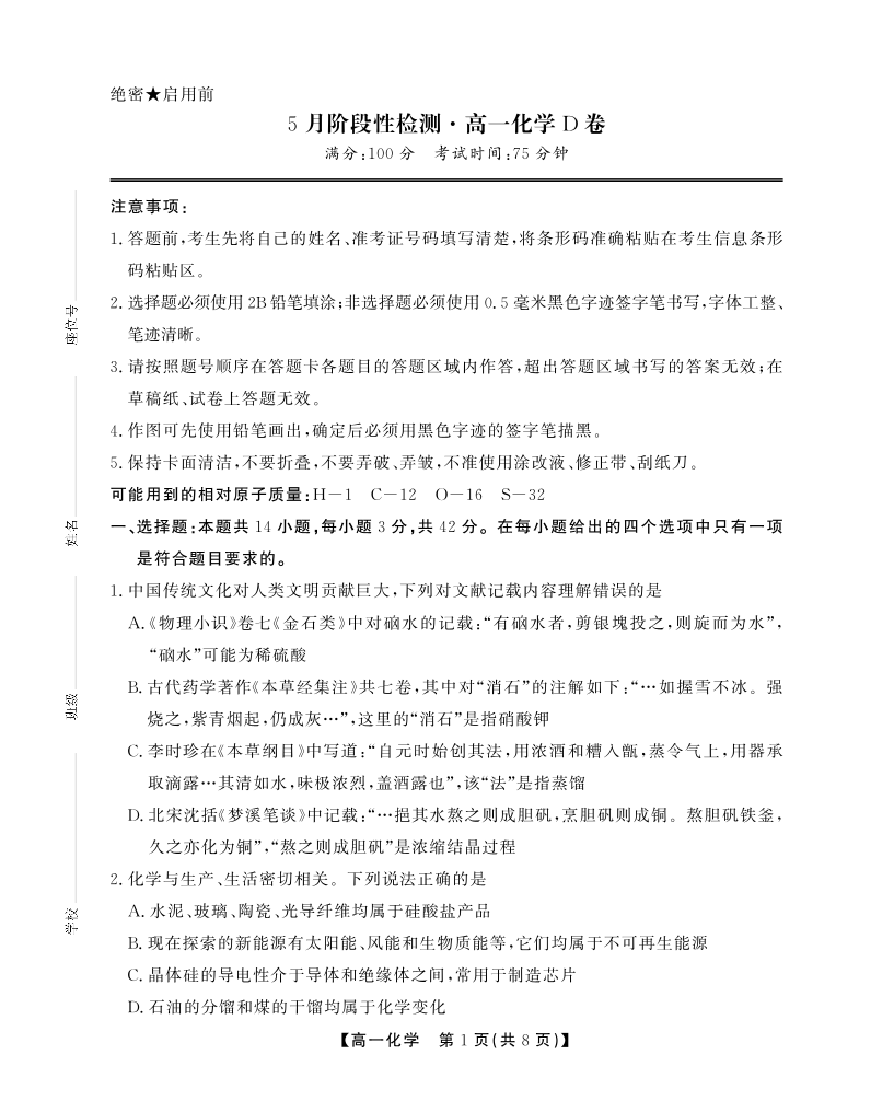 安徽省鼎尖名校高一5月阶段性检测 化学D卷.pdf