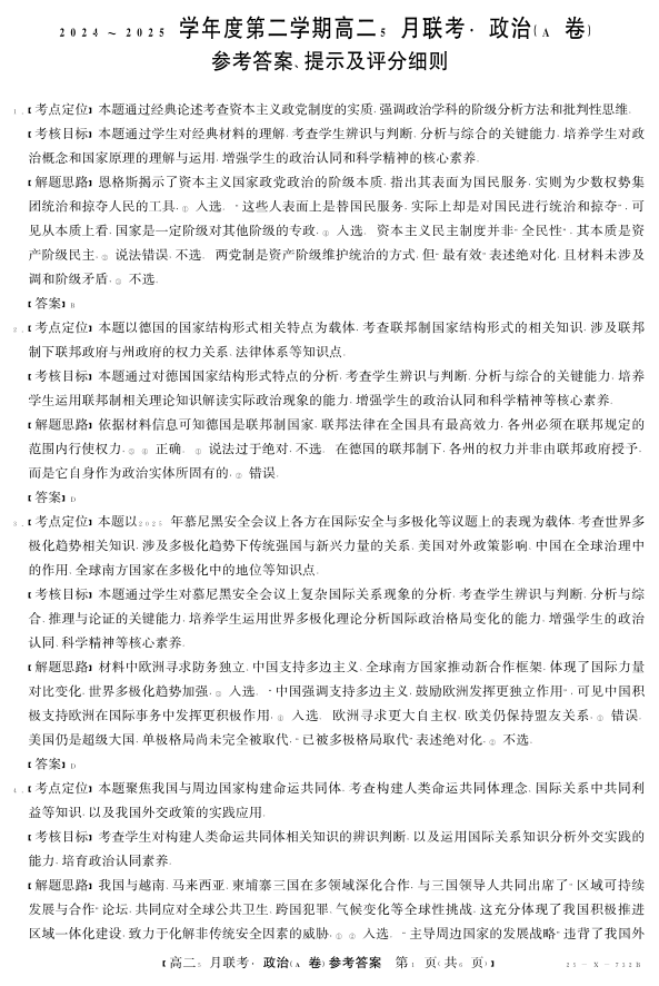 安徽省县中联盟2024-2025学年高二下学期5月联考 政治答案.pdf